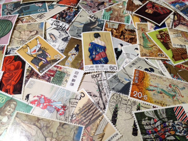 日本の切手で和風なものを並べてみました。絵画シリーズなど結構大きいものが多いです。