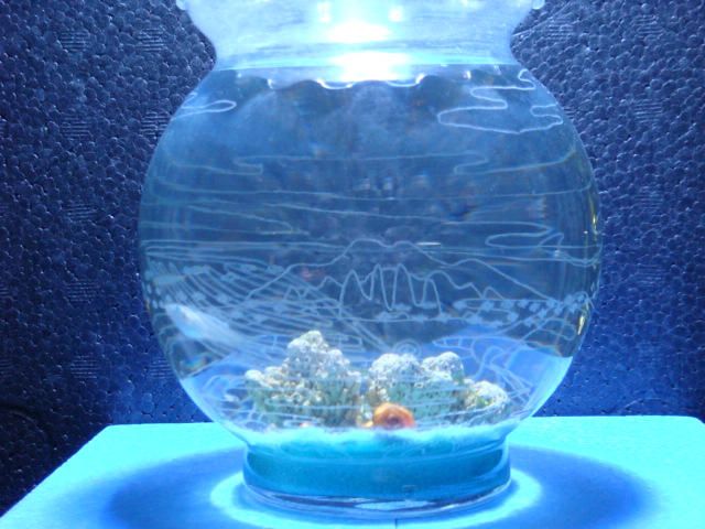ライトをつけると宇宙をイメージした金魚鉢の中に生態系の宇宙が。