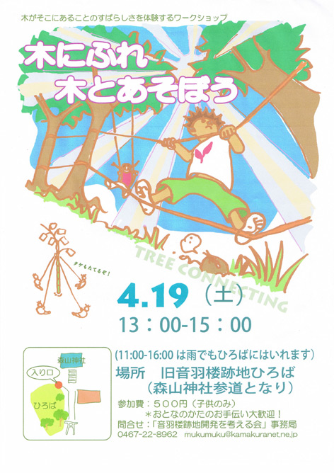 森山神社の参道とその景観を守ろうと始められた「音羽楼跡地開発を考える会」の活動。4000名近くの方々の署名に後押しされ、新たな所有者の方の力添えで、参道沿いの緑が残るところまでたどり着くことができました。それを記念して、その樹々をただ眺めるだけでなく、樹に触れ、遊ぶことを通して、樹がそこにあることの素晴らしさを体験するというワークショップを開催します。当日は、所有者のご厚意で、敷地を開放していただくことができました。参加の方は「旧音羽楼跡地」にお入りください。 | ■期間 08年4月19日 (土) ■時間 11:00〜16:00 ■会場名 音羽楼跡地 ■会場所在 ■料金 500円/日(子供のみ) ■問合せ先 音羽楼跡地開発を考える会 ■電話番号 046-875-9759 ■メールアドレス 2008/4/11 登録 2177クリック |