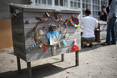 海の漂着物でアート作品を創るシキヤ先生を招いて、生ごみ処理容器「バクテリア de キエーロ」を使ってみんなで作品づくりをします。
