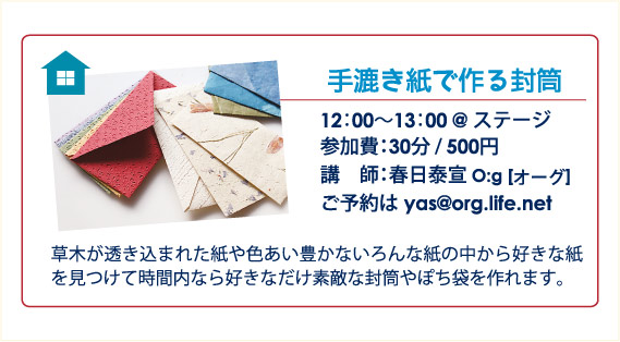 草木が透き込まれた紙や色あい豊かないろんな紙の中から好きな紙を見つけて時間内なら好きなだけ素敵な封筒やぽち袋を作れます。