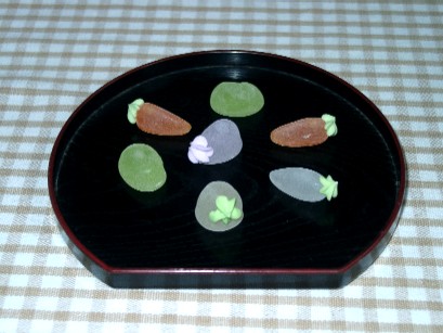 さるところから[京やさいボンボン]をいただいた。ナス、ニンジン、カブ、ダイコン、ソラマメの5種類の野菜がお砂糖で作られてて、中にリキュールが入ってた。かわいくてキレイなのでデジカメしてみただす。葉山とか三浦の名産物でおなじようなもの作ると、どうなるべ?(笑)