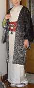 履物は黒の螺鈿の下駄に板絞りの鼻緒。 |