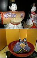 木目込み雛とコネコネして作った抱き雛、お椀の蓋に乗って一寸法師のよう。 |