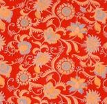 仕立てあがった帯は、派手な赤色の更紗模様。全通模様のようですが、実はお太鼓柄です。 |