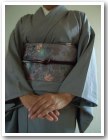 合わせたのは,夏大島.これはどちらかというと6月の単衣ですが,どうしてももう一度袖を通したくて,帯はチャコールグレー地にピンクで更紗模様が描かれている名古屋として,ちょっと秋らしさを出した(つもり).帯揚げは帯に合わせ,ピンクの縮緬.帯締めはぼかしの冠紐.