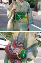 買ったときに教えてもらったのだが、この帯、腹部分になるところに小さなポケットがある。古い帯にはたまにあるとか。お金が入っていることもあるらしい。見つけたらラッキー! の気分やね。 |