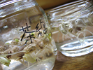 写真は蒔く前の種。向かって左が茶綿。昨日よりも根っこが伸びていました。 |