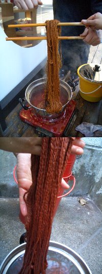 画像下は、その後ミョウバンで媒染し水洗いした糸 |