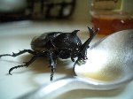 画像は、さっき車の下から出てきたカブトムシ。蜂蜜を薄めたものをあげた |