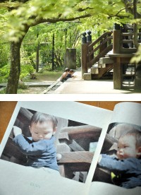 あとで写真を見返してみると、これは彼らなりのちいさな冒険だったのかもしれないと思った。表情がとてもいい。一連の写真に文章をつけて絵本に。題は『かいだんにのぼったよ』。これぞ私家版です。増刷の依頼ももらって、本は海をも渡り、おじいちゃんおばあちゃんにも届けられたよう。 |